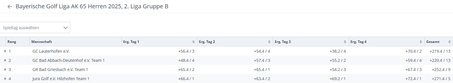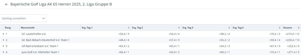 Leider reichte es im Heimspiel nur zum 4. Platz hinter Bayerwald, Straubing und Pleiskirchen. In einem sehr knappen Spieltag hat Bayerwald den 1. Platz mit 2 Schlägen Vorsprung vor Straubing erreicht, Pleiskirchen mit 3 Schlägen Rückstand auf Straubing und 2 Schläge vor uns. Damit sind wir vor dem letzten Spieltag am Tabellenende, aber bei den knappen Ergebnissen ist noch alles möglich.